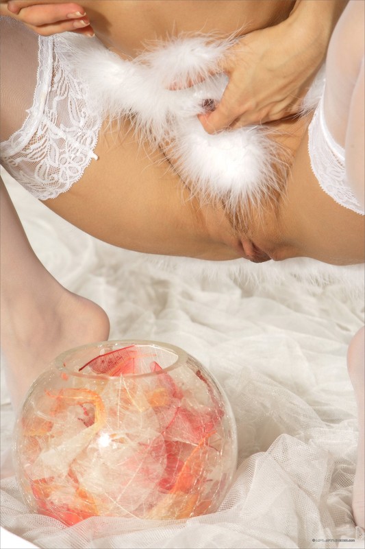 Милашка в белых чулках показала письку крупным планом порно фото